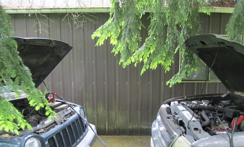 This was a two jumping process. With a session of yelling in the middle because I had complete disconnected and moved the jeep only to have the truck sputter and die again.